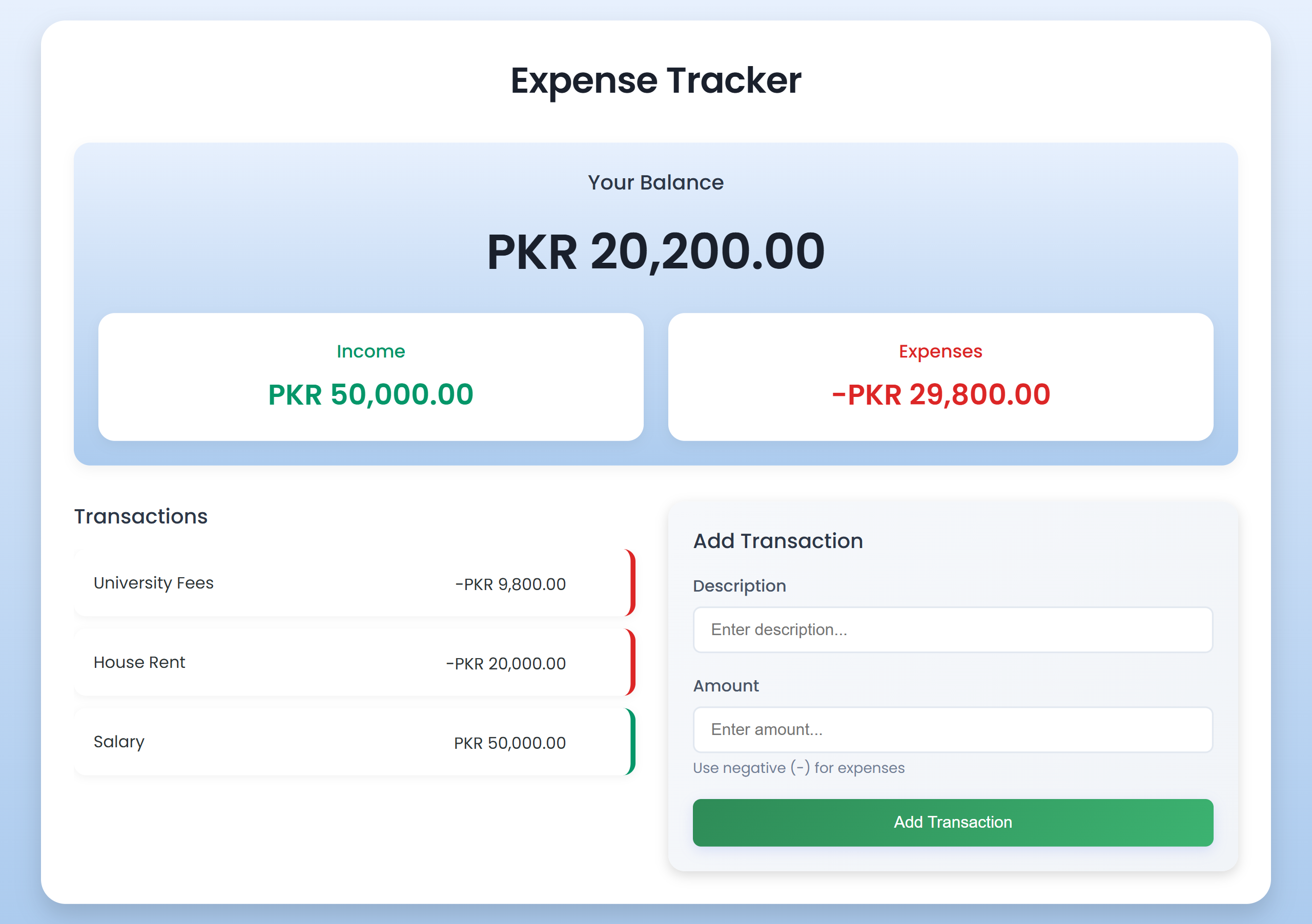 Responsive expense tracker using JavaScript records transactions, manages income and expenses, stores data with localStorage, and updates balances instantly.