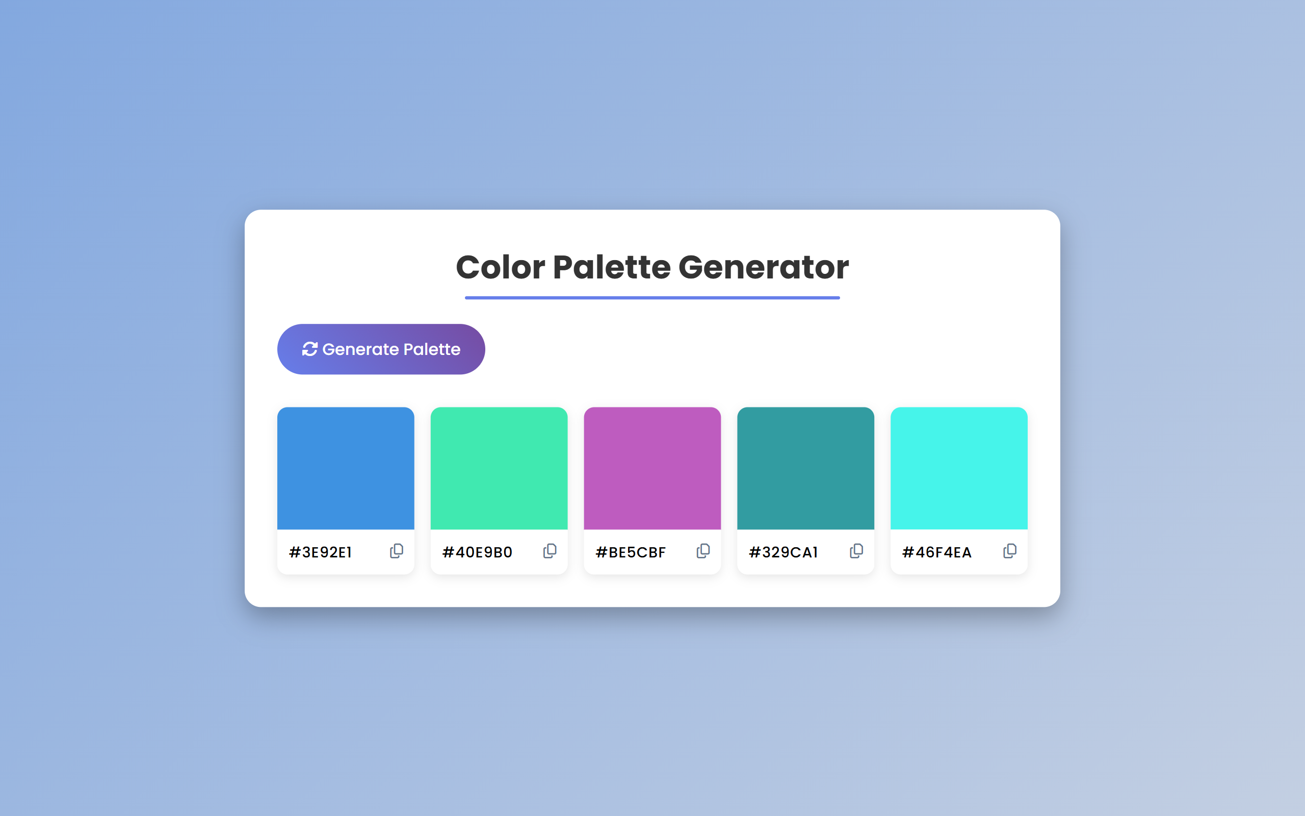 Responsive color palette generator using JavaScript generates HEX codes instantly, enabling designers to copy, explore, and build modern UI color schemes.