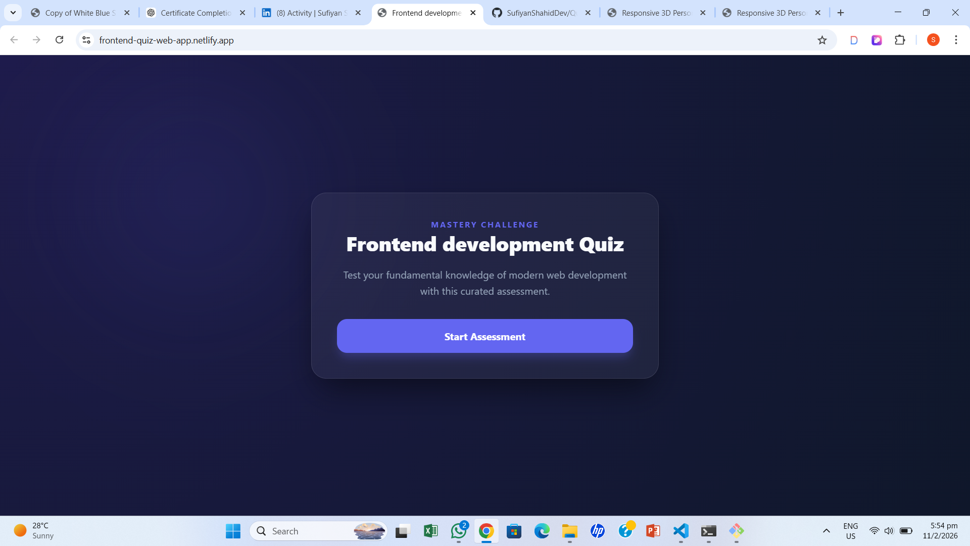 I built a responsive quiz web app using HTML, CSS, and JavaScript, featuring real-time scoring, validation, and smooth user interactions.