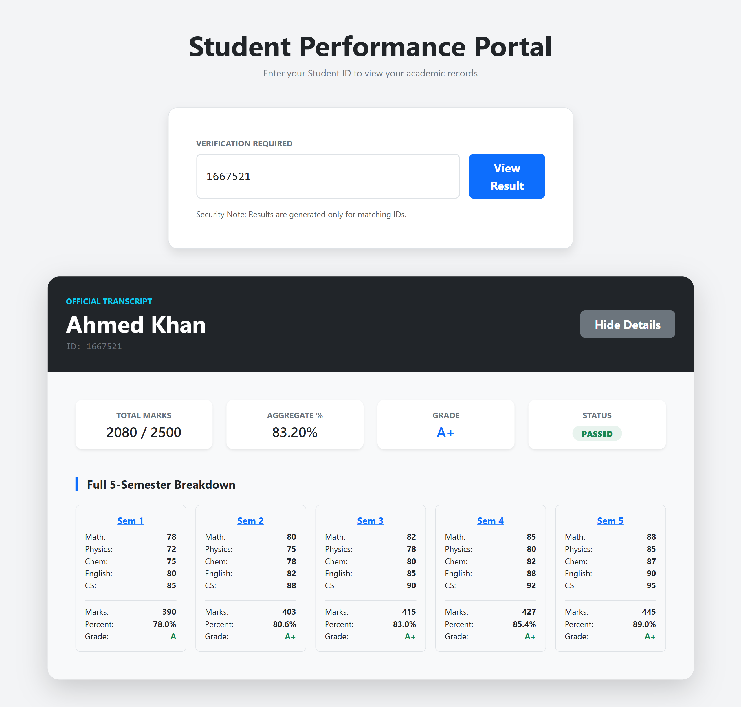 I built a responsive student result management system using HTML, CSS, Bootstrap, and JavaScript, enabling semester-based results, validation, and calculations.