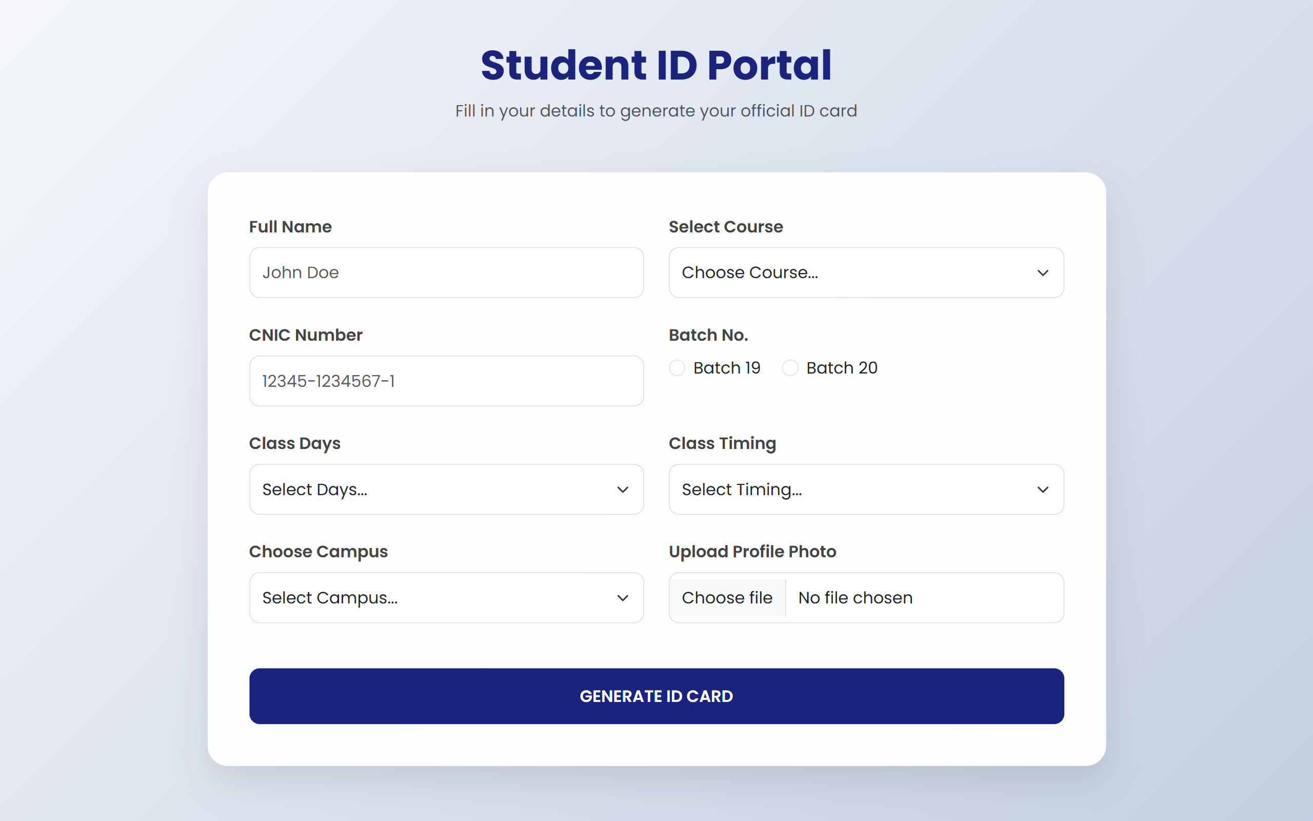 A dynamic student ID card generator using HTML, CSS, Bootstrap, and JavaScript with validation, printing, and responsive design.